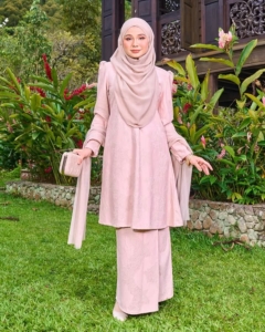 Setelan baju kurung Melayu bisa dijadikan pilihan busana Lebaran yang tak lekang oleh waktu. Potongannya yang longgar dengan ciri khas tradisional memberi kesan anggun sekaligus tetap sopan. Atasan berupa tunik panjang yang dipadukan dengan rok atau celana senada menghadirkan tampilan rapi dan elegan. Untuk menambah pesona, kamu bisa padukan dengan jilbab segi empat atau pashmina berwarna senada agar keseluruhan gaya terlihat harmonis.