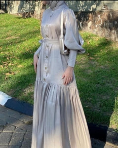 Dress A-line dengan detail puff sleeve menjadi salah satu model busana Lebaran 2026 yang paling diminati. Selain tampilannya yang mewah, dress ini tetap nyaman dikenakan sepanjang hari berkat material ringan seperti satin atau crepe. Siluet A-line yang melebar di bagian bawah memberi ilusi lengan tampak ramping, anggun, dan feminin. Untuk kesan elegan tanpa berlebihan, pilihlah warna pastel atau monokrom yang menonjolkan kesederhanaan sekaligus keanggunan.