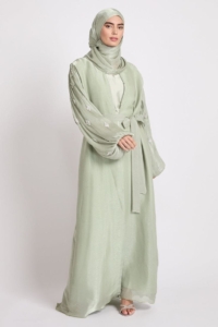 Sage Green tetap menjadi salah satu warna favorit. Hijau dengan sentuhan abu-abu ini menghadirkan nuansa alami sekaligus menenangkan. Kamu bisa memadukannya dalam dress A-line, tunik, atau setelan keluarga. Karakternya fleksibel dan sesuai untuk berbagai jenis kulit. Jika ingin tampil serasi dengan keluarga dalam satu tema warna, Sage Green adalah pilihan yang kokoh. Di tengah tren warna earthy, Sage Green terus menempati posisi penting dalam tren Warna Baju Lebaran 2026 berkat kesan timeless yang dimilikinya.